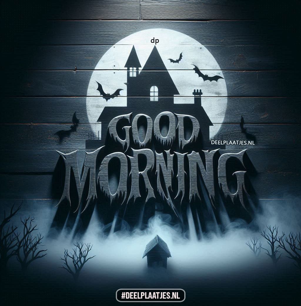 Een mysterieuze ochtend in Halloweenstijl! Op het plaatje staat een spookachtig huis in het maanlicht, omringd door vleermuizen, kale bomen en een dikke laag mist. De tekst “Good Morning” verschijnt in gotische letters vol schaduw en sfeer. Perfect om te delen op een herfstige ochtend vol spanning, griezelpret en een vleugje duistere humor 🎃🌕🦇👻🌫️ Good Morning Halloween SpookyMorning Creepy Vibes AutumnMood